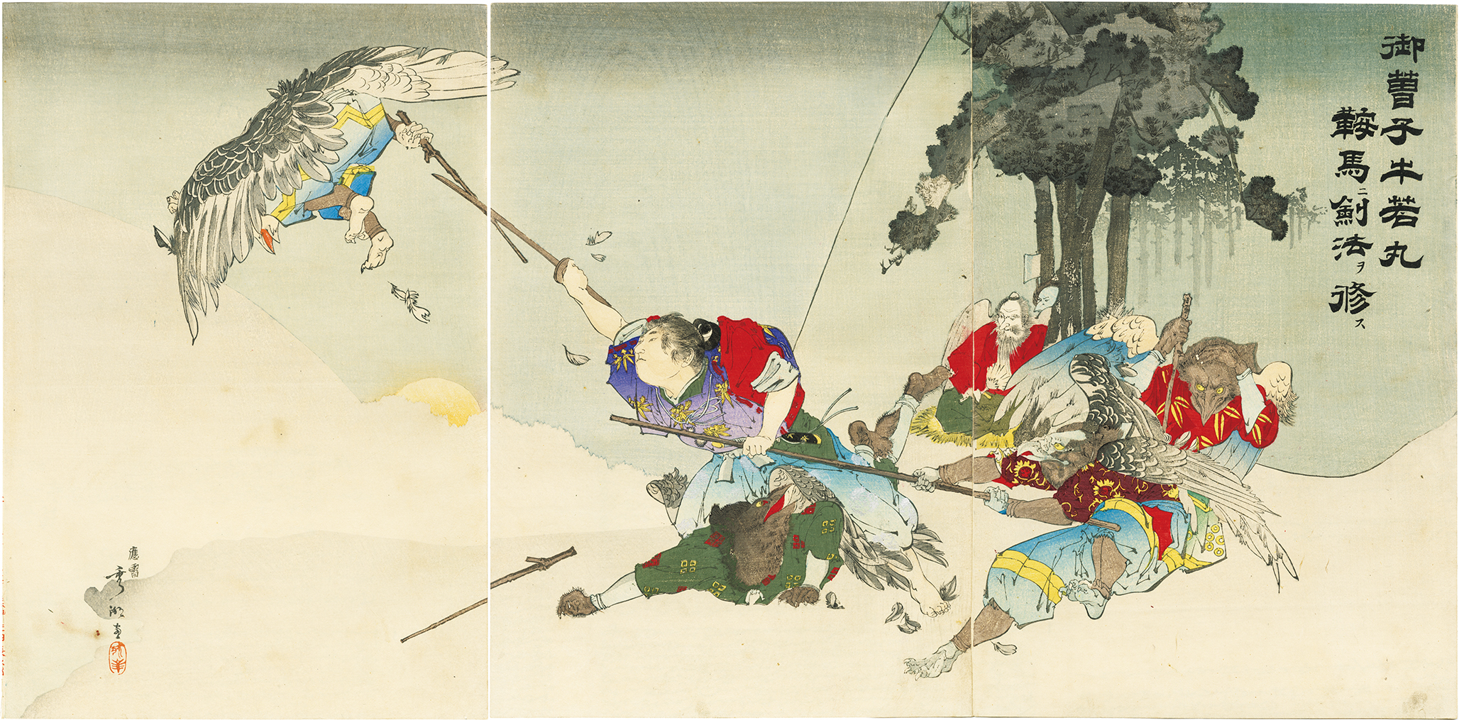 The boy wielding the sword in the center is Ushiwakamaru, later known as Minamoto no Yoshitsune.