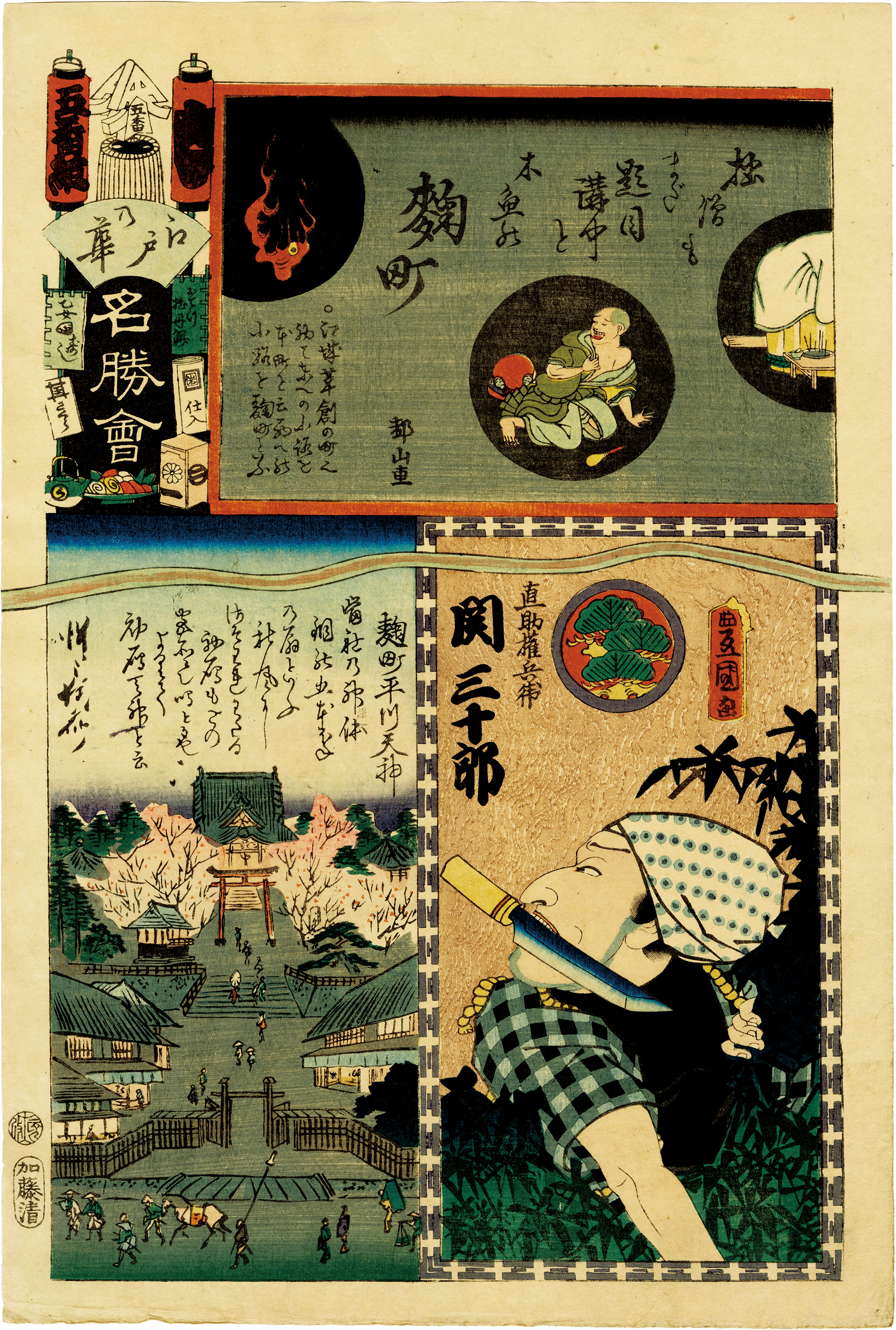 This series was created by several artists, mainly ToyokuniⅢ, and it combined a group of firefighters who were called "Flowers of Edo", local specialties, and popular Kabuki actors. Shopping Guide & Information of the Japanese Prints