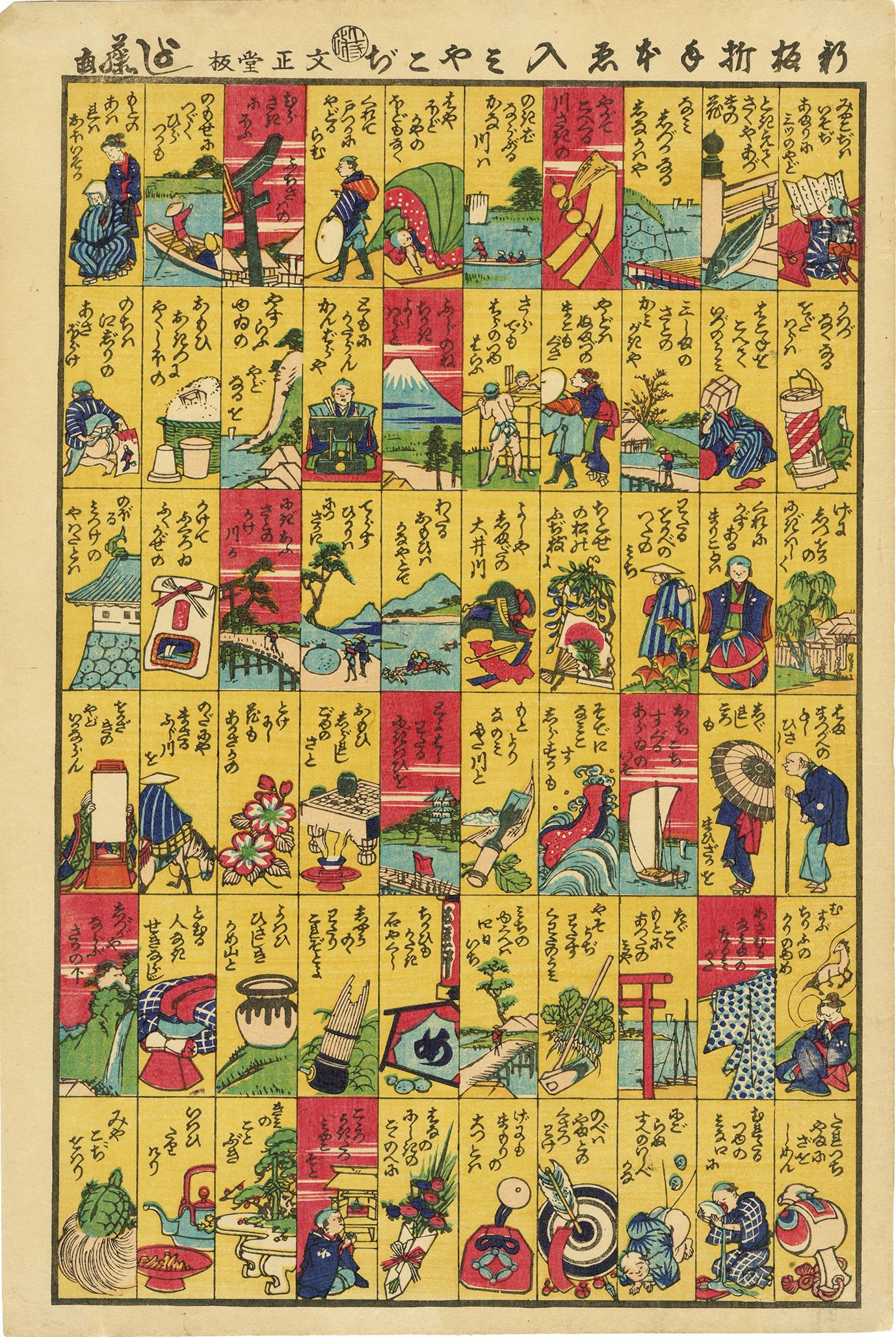 芳藤は国芳の門人で、多くのジャンルの浮世絵を手がけた。特に子供向けの玩具絵において丁寧な仕事をしており、「おもちゃ芳藤」と呼ばれたという。子供が見て遊ぶために制作された玩具絵故に、現在まで良好な状態で残っているものは数少ない。