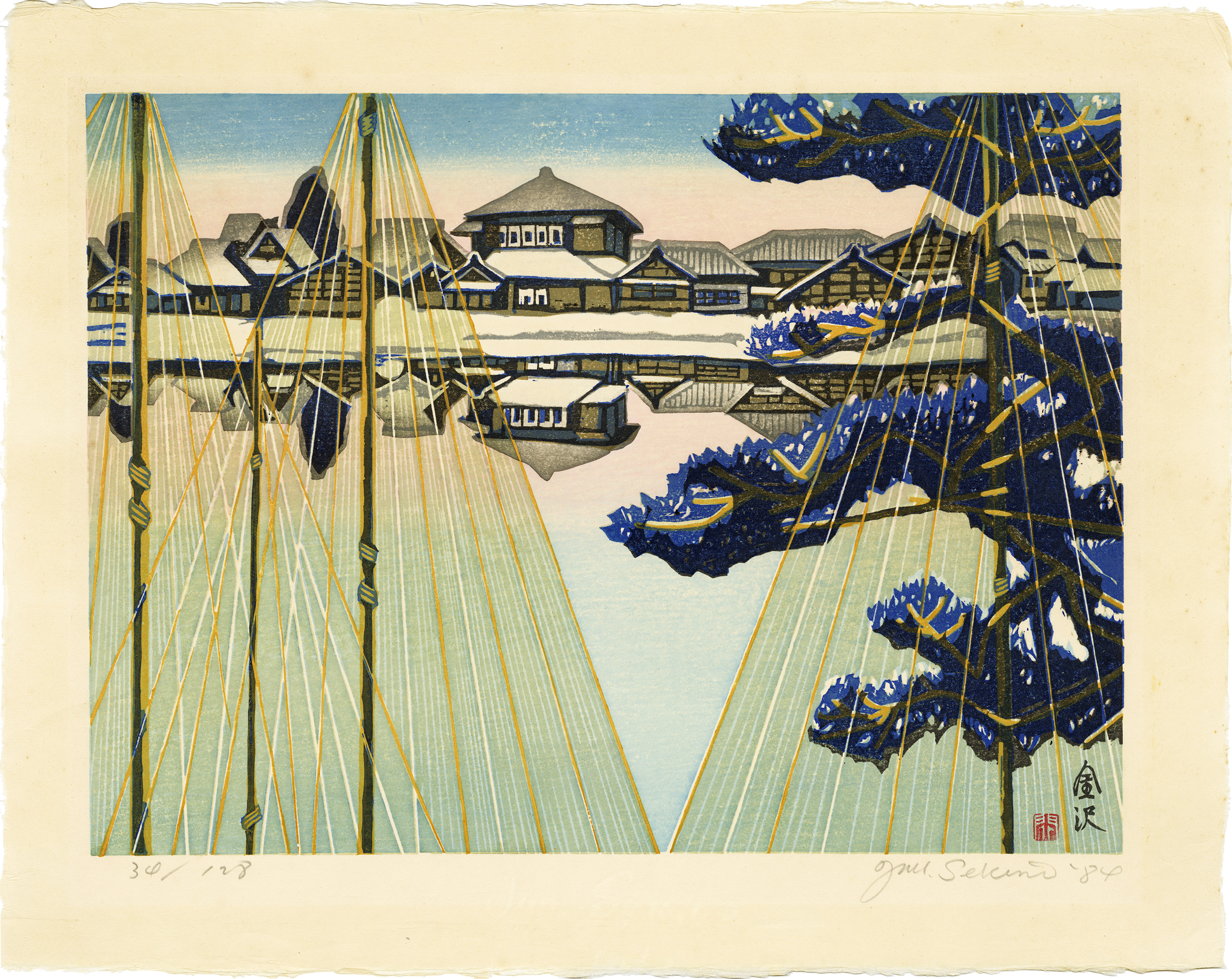After gaining recognition for various print exhibitions in Japan, Sekino was invited by the Rockefeller Foundation, Ford Foundation, and Oregon State University and visited the United States. Perhaps influenced by the colors of American art, he produced more vivid works after returning to Japan. In his 53 Stations of the Tokaido series, Sekino captured the scenery from a unique perspective typical of his travel experiences, leaving behind many colorful and appealing works.