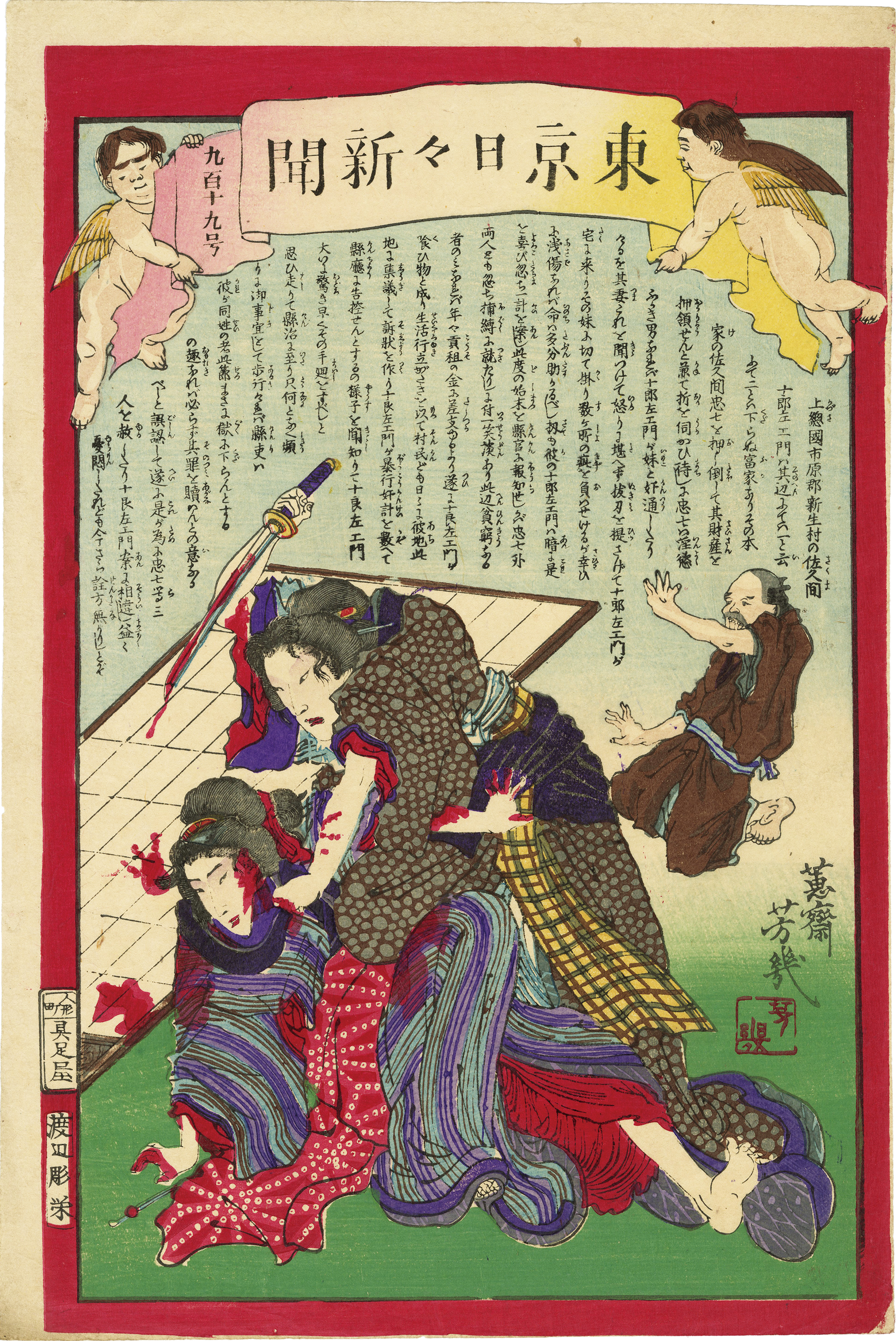 Tokyo Nichinichi Newspaper is the former name of The Mainichi Newspapers Co., Ltd. It was a modern newspaper published after the Meiji Restoration. These newspaper prints, with their eye-catching pictures and detailed gossip reporting, were popular among commons seeking stimulation and sold well.