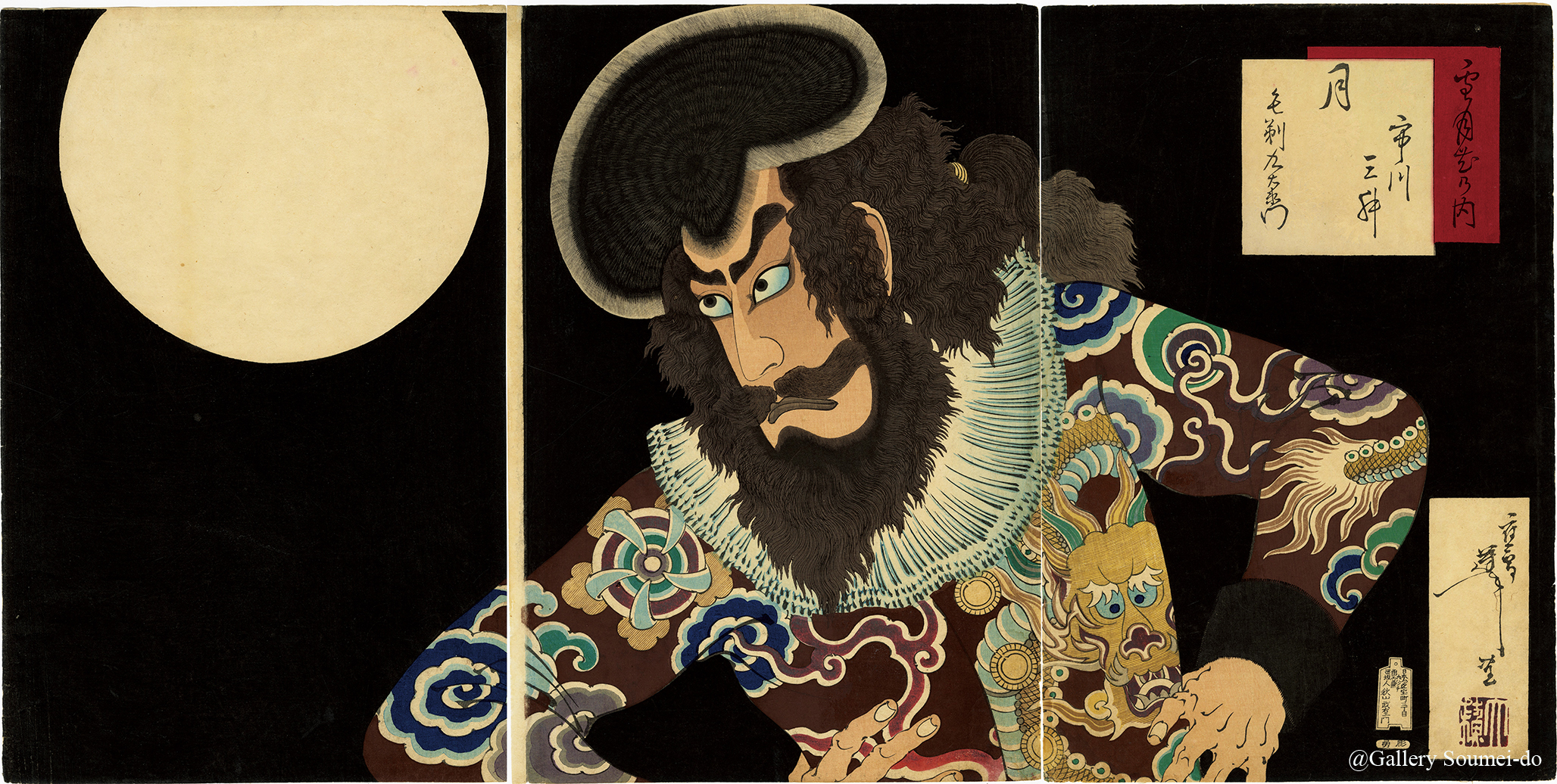 This triptych yakusha-e (actor's picture) shows Ichikawa Sansho in an exotic costume playing the role of Kezori Kuemon, the great pirate master in the play "Hakata Kojoro Namimakura" by Chikamatsu Monzaemon.