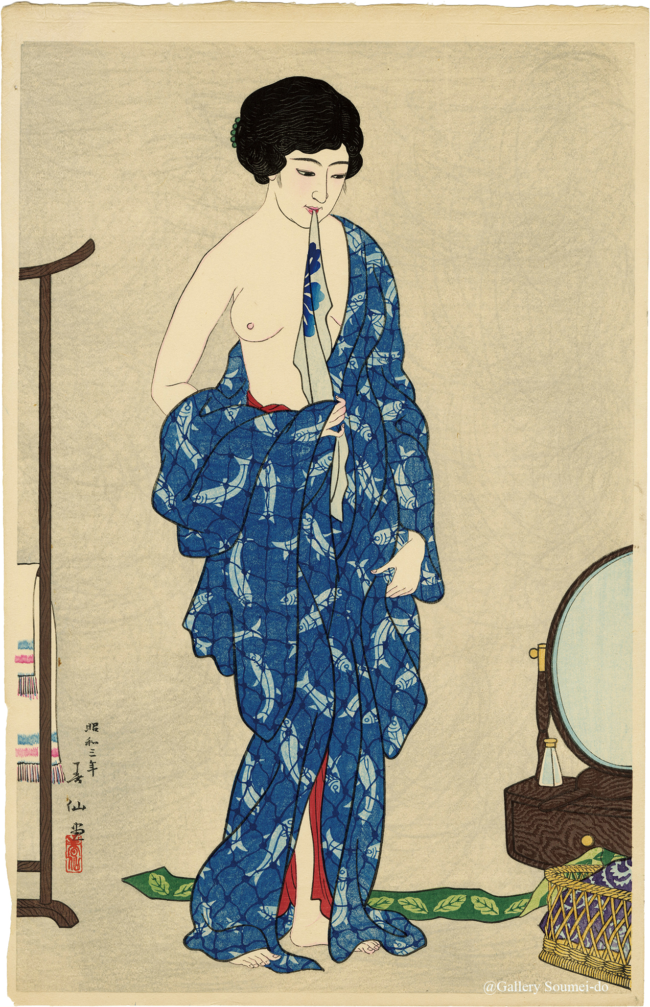 浴後の美人を描いた一枚。鮎だろうか、涼しげな藍色の着物には気持ちよさそうに泳ぐ魚が描かれ、夏の気配を感じさせる。