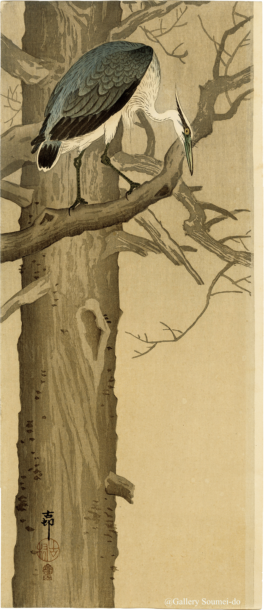 This work, published by Kokkeido, stands out for its exceptional sense of tranquility and elegance among the large-format prints issued by the publisher. Making full use of its tall, vertical composition, it depicts a blue heron quietly perched on a tree branch placed in the upper portion of the image. Shopping Guide & Information